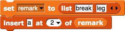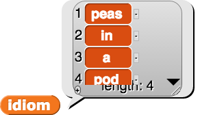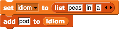 You might be wondering why we put .append("pod") after the idiom list. This is an instance of Object Oriented Programming (OOP), which we talked about in the Programming Paradigms lecture. The list idiom is an object. Objects can have their own functions. In Python, every list object has an append function. In contrast with the add block in Snap!, when we use the .append("pod") function we don't need to specify which list to use. The reason for that is that we are telling the idiom object to use its append function.